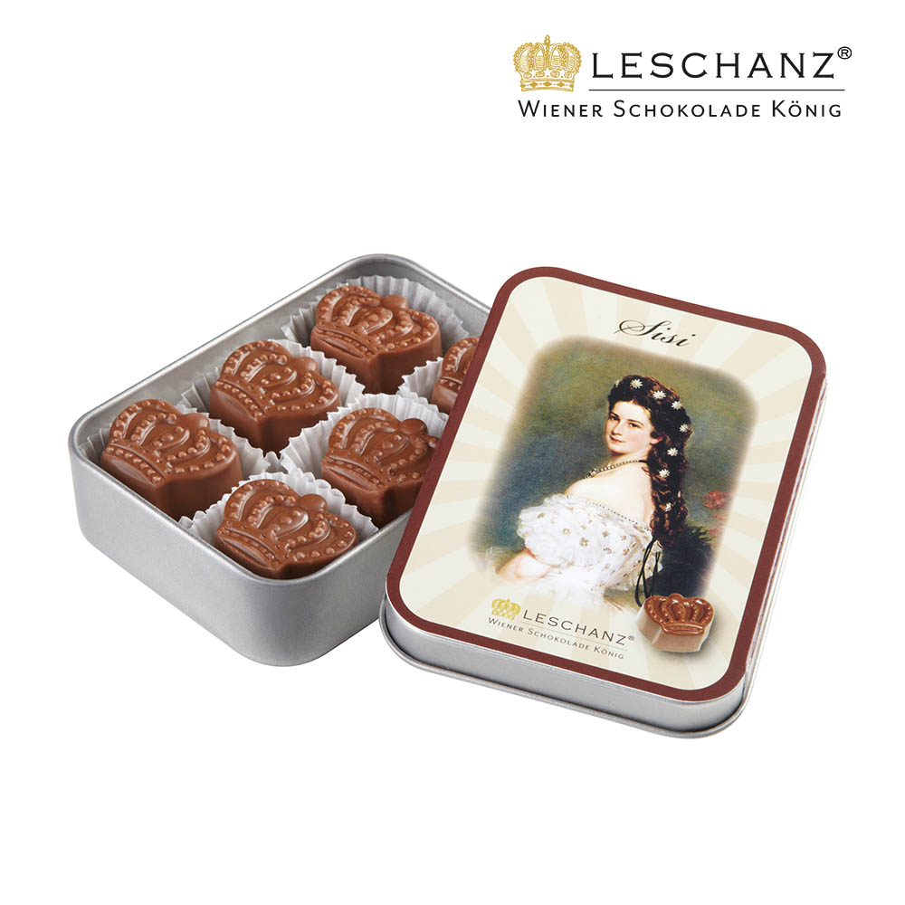 Edelvollmilch-Schokolade gefüllt mit feinstem Haselnusskrokant in edler Metalldose mit Kaiserin-Sisi-Motiv